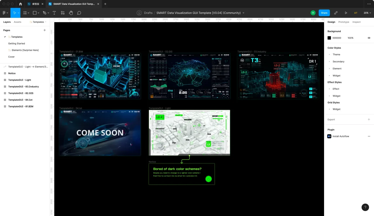 SMART UI-Kit是一套使用Figma设计工具构建的数据可视化2D界面设计组件库,完全开源免费使用,并在Figma社区内持续更新!这个项目构建的初衷旨在验证Figma工具对数据大屏设计的可行性,希望能结合Figma轻量级、高灵活性、高组件化的优势给数据可视化大屏设计提供全新的工具选择。欢迎在Figma社区下载使用,Hope u will enjoy it!