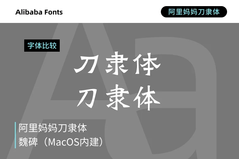 阿里妈妈刀隶体是一种改良自毛笔书法字体的字体,相较于 MacOS 内建的魏碑体,刀隶体在字体设计上削减了一些书法字体的细节。每一笔的结尾都显得活泼俏皮,字体的重心也略微偏高,非常适合应用在文化创意、艺术和复古风格的海报、主视觉设计以及标准字等方面。
