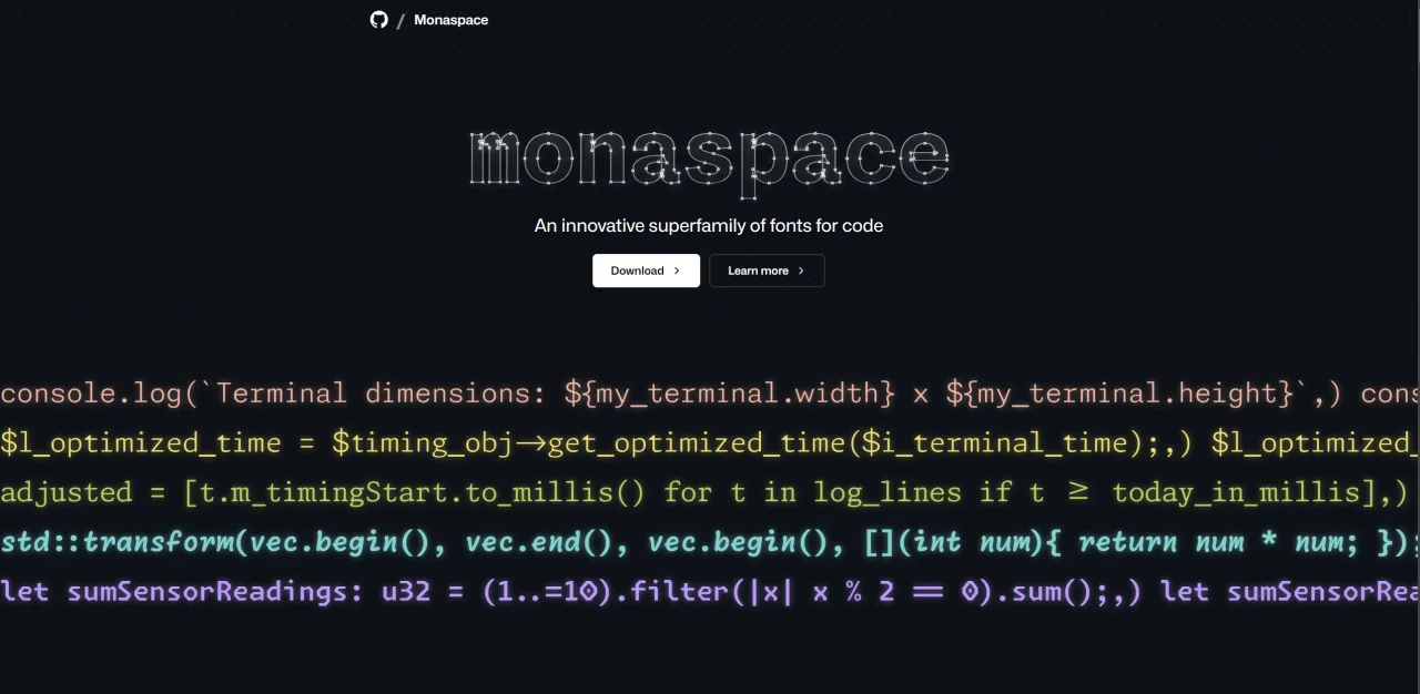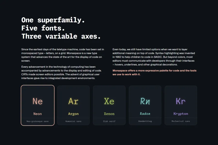 GitHub 推出了名为 Monaspace 的开源字体家族,拥有五种风格可选: