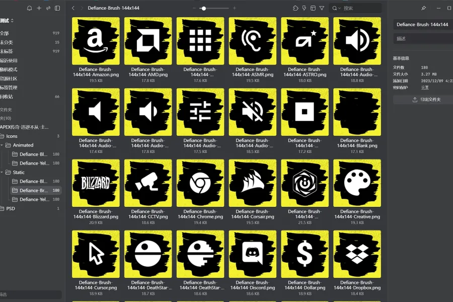 参考来自《APEX传奇》第十二赛季的设计风格,包括180张手工制作的图标。每个图标都有三个静态背景集合(黑色、黄色、画笔)和两个动态集合。