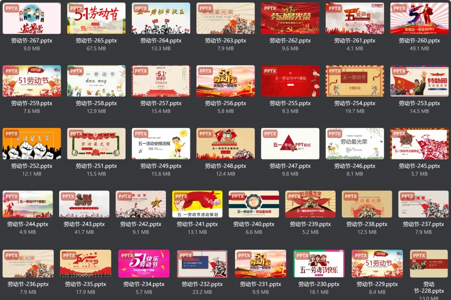 293套五一劳动节PPT模板,由于文件比较大,所以源文件放在迅雷网盘里的,迅雷网盘中有PPT源文件也有eagle格式的资源包。需要的可自取。