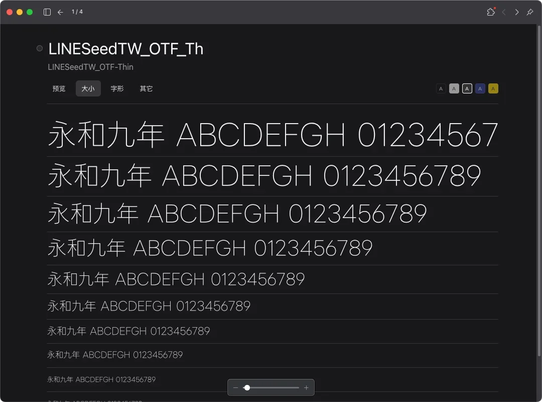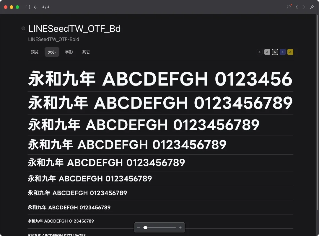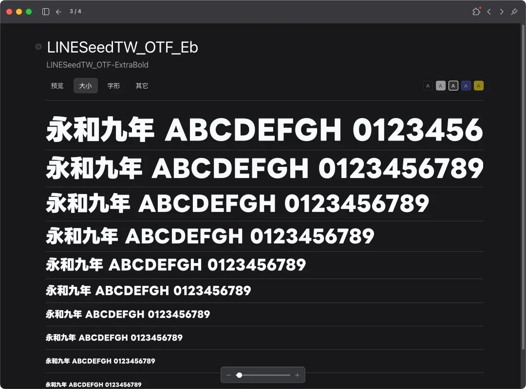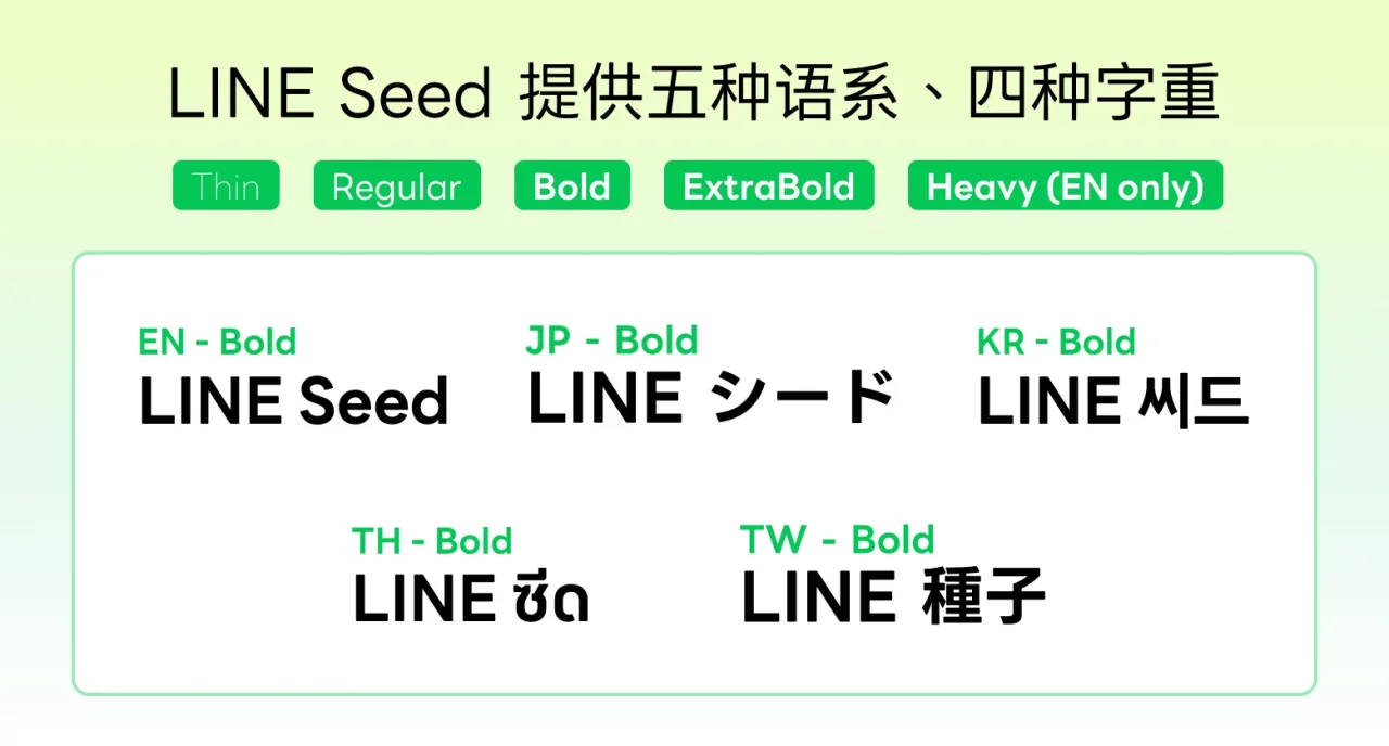 目前 LINE Seed 共支援五种语系:EN、JP、KR、TH、TW。除 EN 语系额外提供 Heavy 字重外,其余皆包含 Thin、Regular、Bold 与 ExtraBold 四种字重,搭配弹性相当高。