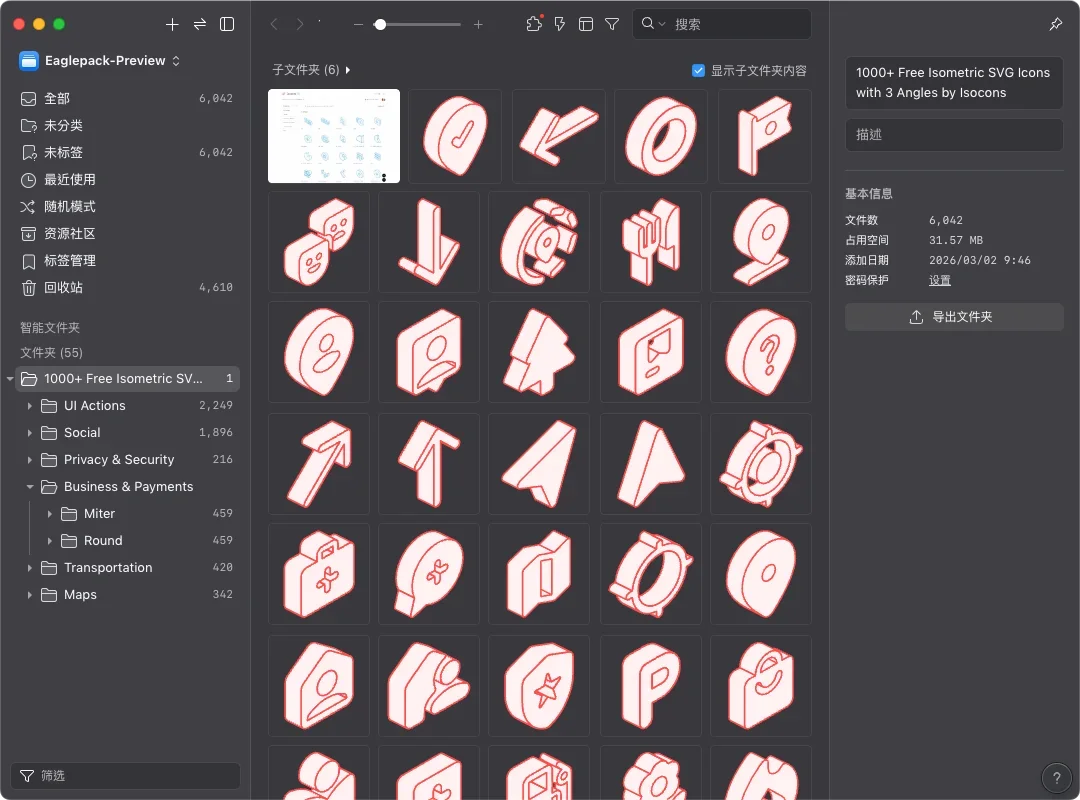 如果你正在寻找一套系统化且具质感的立体矢量资源,这组 Isocons 绝对值得收藏。我已经将这 1,000 多个图标打包成 SVG 格式的 Eaglepack,让你下载后即可在 Eagle 中快速检索与分类。现在就获取这套素材,让你在下次处理网页插画或演示文稿设计时,能随手拈来专业的等距视觉元素!