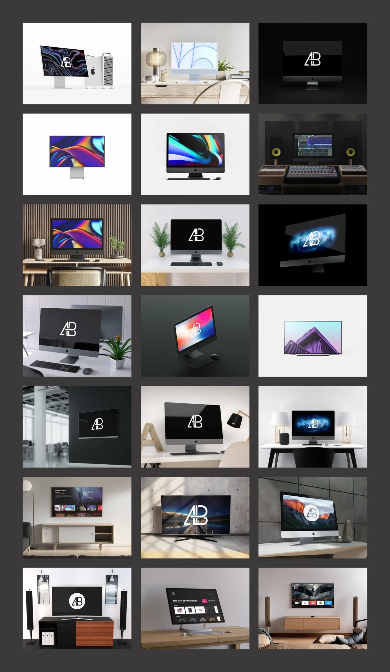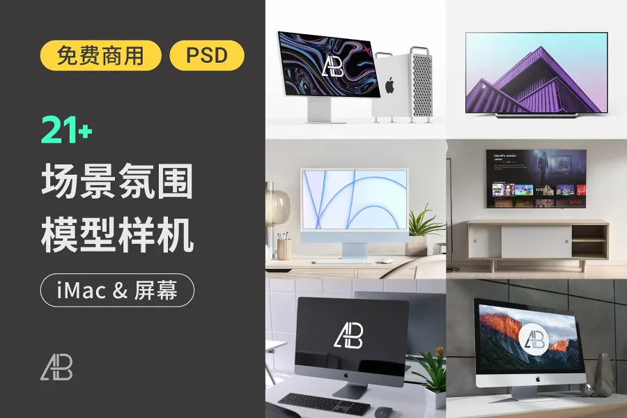 这组萤幕样机模型集合了 21 款 iMac 样机,包括 2021 年版 iMac 模拟合成图,以及几个电视萤幕的模型。