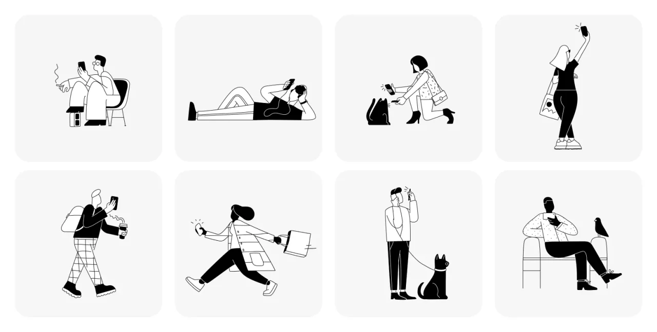 如果你正在寻找可以免费下载使用的人物插画,这套 Phonies 极简风人物插图可能就是你所需要的,值得一看!这些简单的黑白 Phonies 人物插画非常适合为你的网站 Landing Page 或移动端 App 增添时尚风格,他总共有 8 个图像,包含各种角色,还有一只狗和一只猫。Phonies 插图在极简中带有一点可爱风,可以灵活运用在各种设计专案之中!