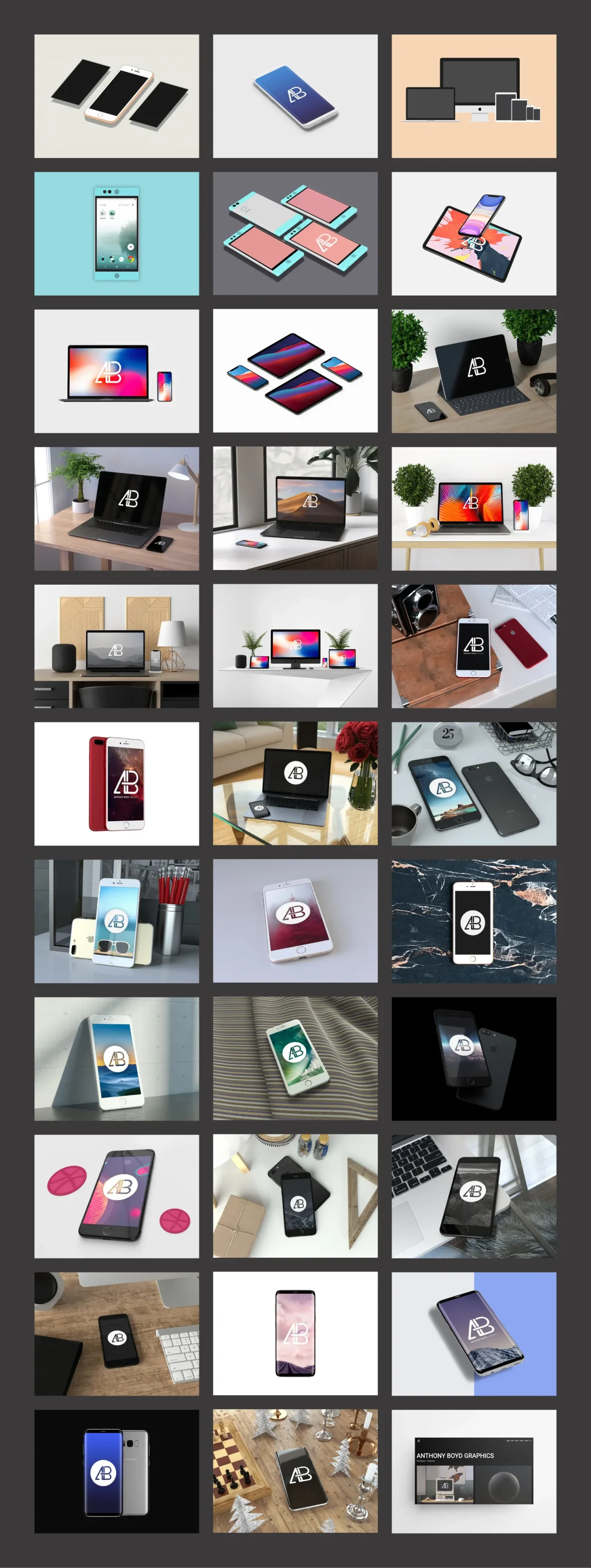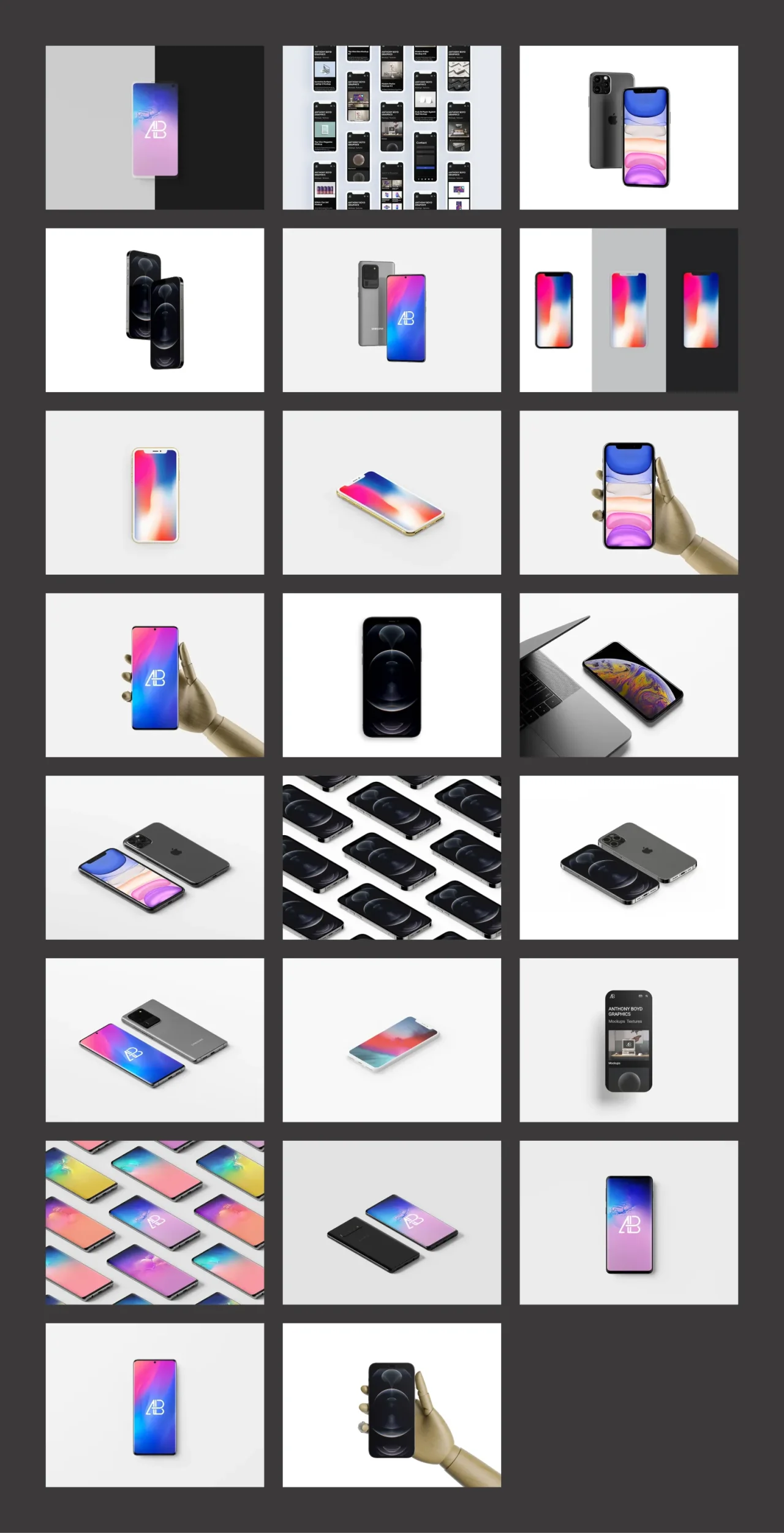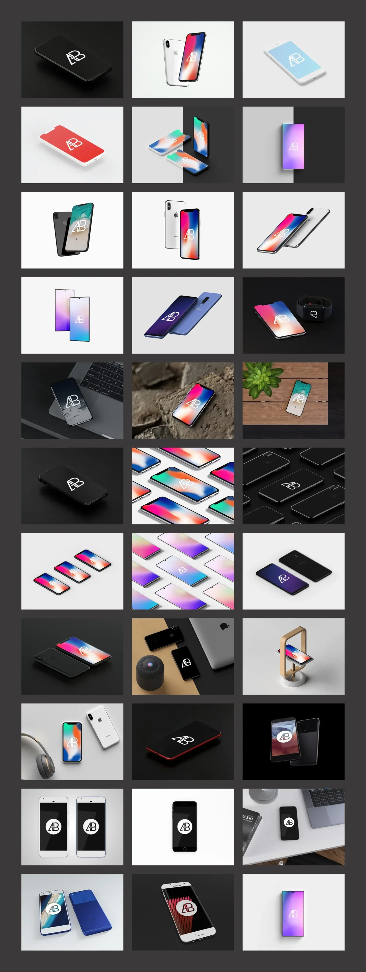 设计师 Anthony Boyd 免费提供了多样的手机样机,除了主流的 Apple 手机之外,还包含了 Google Pixel 和 Samsung Galaxy 等其他牌的手机样机,让需要向使用 Android 系统客户推广、提案的设计师来说,是一大福音。